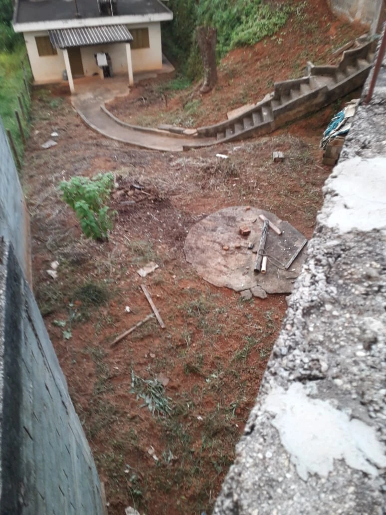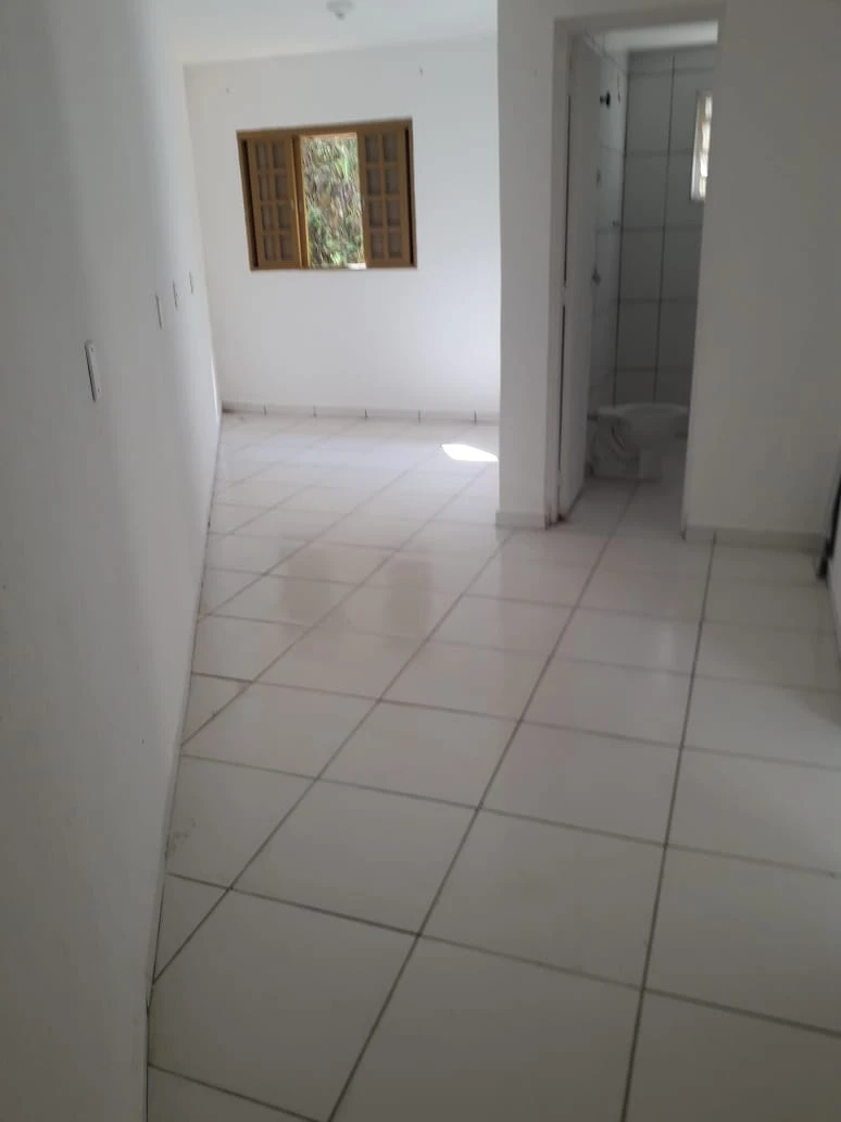 Terreno abaixo do nível da rua, possui uma casa de três cômodos sem vaga de garagem.